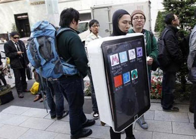 Khách hàng hóa trang thành chiếc iPad trong lúc xếp hàng đợi mua