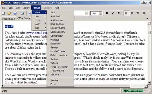 Muốn sử dụng được Ajax 13, ít nhất máy bạn phải có trình duyệt Firefox phiên bản từ 1.5 trở nên. Chương trình soạn thảo văn bản hỗ trợ kiểu dữ liệu ra của Word, Open Office, kiểu text và acrobat (PDF), nhưng xung đột với các lỗi vào/ra Java khi muốn lưu lại file. Trong đợt kiểm tra ban đầu, chúng tôi không thể mở hay ghi file đã soạn thảo theo đuôi của Word hay Excel mặc dù đã cố gắng thử trên một số hệ thống và với Firefox 1.5, 2.0. Bất cứ khi nào mở file trên ổ cứng, chúng tôi nhận được một thông báo ngắn gọn "Please Wait" (xin chờ), nhưng dù ngồi cả tiếng đồng hồ thì file đó vẫn không được mở.