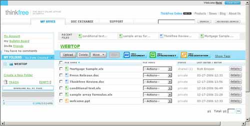 Trang đang mở của ThinkFree cho bạn biết các file được chỉnh sửa gần đây nhất |