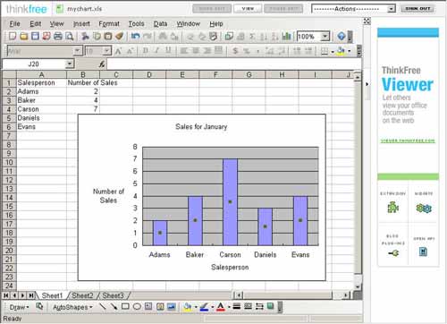 Ưu điểm: ThinkFree ẩn thanh menu trong trình duyệt của bạn. Vì thể khi sử dụng các phím tắt quen thuộc (như Alt+F, O để vào File/Open) chính là bạn đang hoạt động bên trong giao diện ThinkFree chứ không phải trong trình duyệt của bạn. Một số điểm khác hoàn toàn tương tự như Microsoft Office. Phần sơ đồ trong ThinkFree Calc trông giống như của Excel và hỗ trợ tất cả kiểu đồ thị của Excel.
