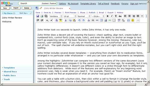 Zoho Write thực hiện việc chuyển đổi các thành phần cơ bản bạn cần hàng ngày rất tốt: kiểm tra chính tả, căn chỉnh lề đoạn văn bản, tạo các dấu chấm hay ký tự, chữ số đầu mỗi đoạn, điều khiển font (cỡ chữ, kiểu chữ, màu sắc). Tuy nhiên ngoài các chức năng cơ bản đó thì nó không làm được gì hơn. Nó không giàu tính năng như ở Word hay ThinkFree: bộ kiểm tra chính tả sẽ gạch chân các lỗi gặp phải nhưng bạn không thể kích phải chuột và tìm ra cụm từ đúng trong một danh sách.