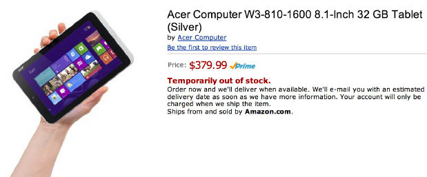 Tuần trước, hình ảnh mẫu tablet 8 inch chạy Windows 8 mang tên Iconia W3 của Acer đã được đăng tải. Và sự hiện diện của chiếc máy tính bảng này không còn xa nữa khi mới đây nhà bán lẻ Amazon đã bày bán trực tuyến Iconia W3 trên trang web chính của mình.