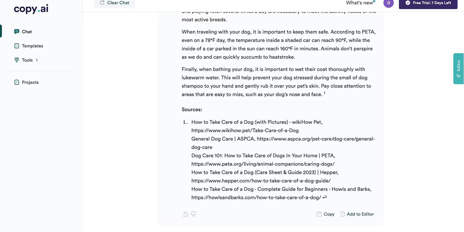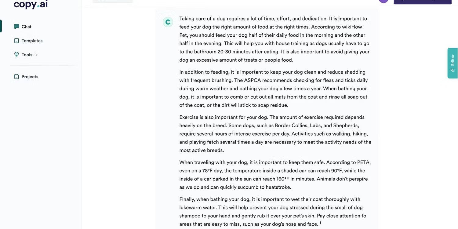 AI tránh những điểm không chính xác bằng cách tạo ra các phản hồi chung chung. Lấy đoạn trên làm ví dụ. Khi yêu cầu một công cụ viết AI nói về việc chăm sóc chó, nó tập trung vào các mẹo siêu phổ biến mà người đọc có thể đã thấy nhiều lần. Bức ảnh dưới đây cũng cho thấy thông tin chi tiết của nó đến từ một nguồn không đáng tin cậy.