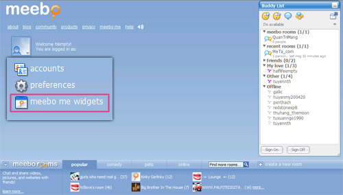 Sau khi các thủ tục đăng ký hoàn tất, đăng nhập và tìm đến Meebo me widgets và bấm vào đó.