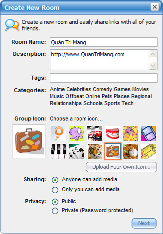 Trong cửa sổ tạo room, bạn đặt tên room (Room Name), miêu tả (Description), tên tag, chọn một biểu tượng (Choose Icon) hoặc đưa biểu tượng hoặc đưa biểu tượng của bạn lên (Upload you own icon), chọn Anyone can add media nếu bạn muốn mọi người đều được phép thêm video, chọn bên dưới nếu bạn muốn chỉ chính mình được làm việc này.