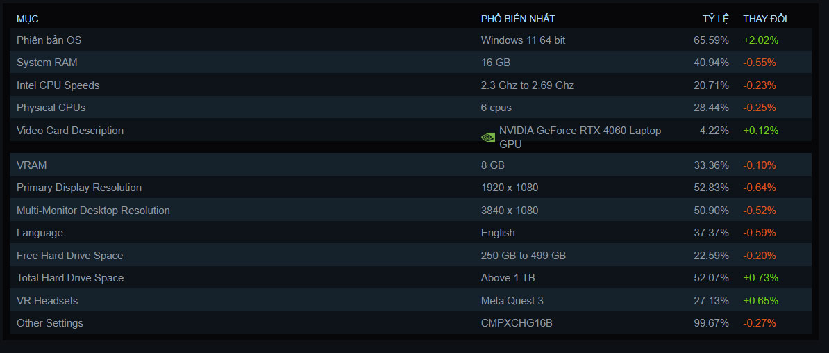 Các lựa chọn phần cứng còn lại hầu như không thay đổi: 16GB RAM vẫn phổ biến nhất (40,94%), CPU 6 nhân chiếm 28,44%, GPU 8GB VRAM chiếm 33,36%, và độ phân giải màn hình 1080p tiếp tục thống trị với 52,83%.
