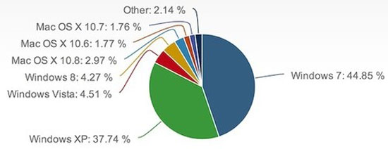 Thị phần của Windows 8 hiện mới chỉ có 4,27%, kém hơn một chút so với Vista đang ở mức 4,51%. Hai hệ điều hành đang nắm giữ thị phần lớn nhất là Windows 7 với 44,85% và XP là 37,74%.