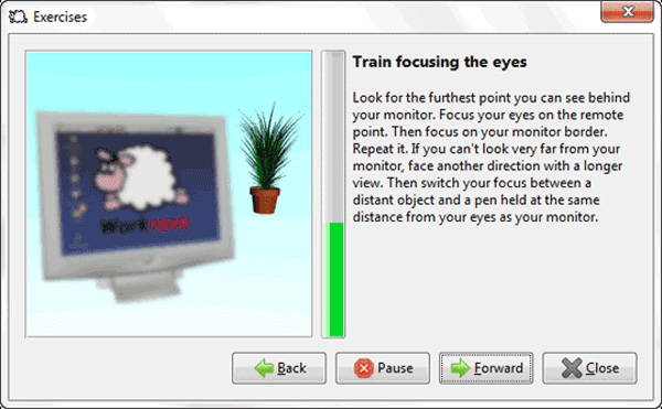 Sau 1 khoảng thời gian cố định, chương trình sẽ hiển thị những hình ảnh chuyển động liên tục như trong video, bạn chỉ cần tập trung vào chuyển động của con trỏ trên màn hình. Màu sắc chủ đạo của những hình ảnh trên là đen và trắng, do vậy mắt chúng ta không phải hoạt động và điều tiết quá nhiều.