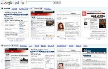 Hãy dùng thử Fast Flip, một tiện ích mới từ Google Labs. Fast Flip cung cấp một giao diện thông minh để tìm kiếm, duyệt và khám phá nội dung Google News. Dù rằng Fast Flip vẫn còn một vài khuyết điểm (cần nhớ, tại thời điểm này chương trình vẫn đang ở giai đoạn thử nghiệm), nhưng nó đã trở thành cách thu thập tin tức trực tuyến ưa thích của tôi
