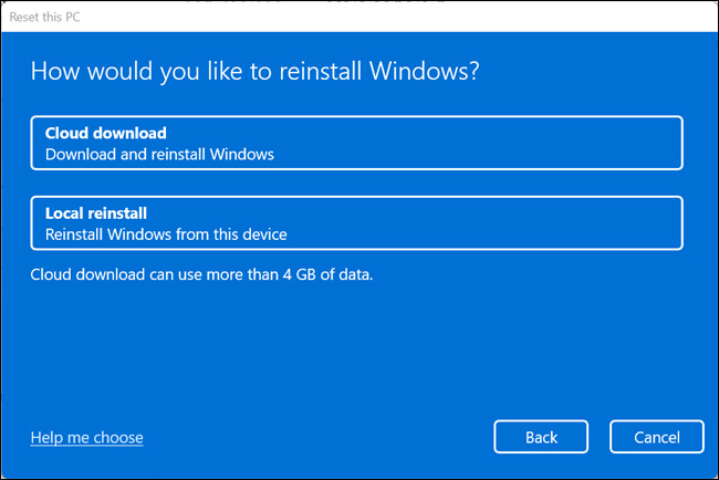 Sau khi bạn chọn 1 tùy chọn, màn hình “How Would You Like to Reinstall Windows” sẽ hiện ra. Nếu muốn cài đặt lại Windows 11 từ đám mây, hãy chọn “Cloud Download”. Trong trường hợp bạn muốn thực hiện cài đặt cục bộ như truyền thống, hãy chọn tùy chọn “Local Reinstall”.