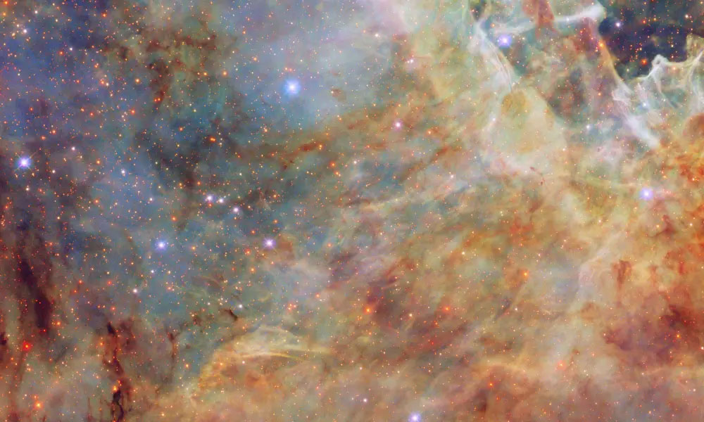 Hình ảnh mới này cho thấy các cạnh của tinh vân, xa hơn so với khu vực trung tâm. Ở giữa tinh vân là những ngôi sao khổng lồ có khối lượng gấp 200 lần khối lượng mặt trời, nhưng ở vùng “ngoại ô” này, quang cảnh có phần tĩnh lặng hơn.