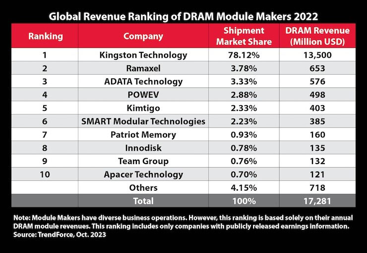 Theo bảng xếp hạng của TrendForce, 5 nhà sản xuất module bộ nhớ hàng đầu thế giới chiếm 90% tổng doanh số bán hàng vào năm 2022, trong đó Kingston giữ vị trí thống trị khi chiếm tới 78,12% thị phần.
