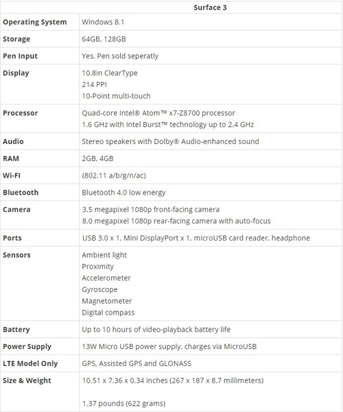 Vì hướng đến phân khúc tầm trung nên Surface 3 có 4 tùy chọn cấu hình với mức giá giao động từ 499 USD đến 699 USD: