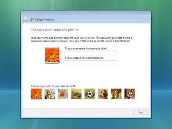 - Chọn user name và một ảnh. Người dùng phải đánh vào một user name, password và tạo một password hint. Việc đánh vào password hint hiện vẫn được yêu cầu trong SP1 của Vista.