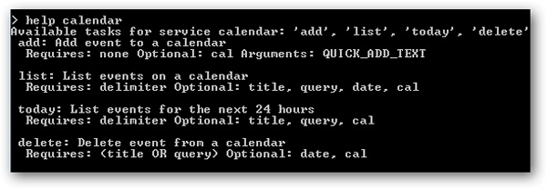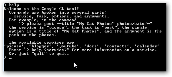 Bên cạnh đó, bạn còn có thể sử dụng GoogleCL để truy cập các dịch vụ khác như Picasa, Blogger, YouTube, Docs, Contacts, và Calendar, trong những phiên bản sắp tới công cụ còn được tích hợp với Gmail và Search. Các bạn gõ help và tên dịch vụ cần tham khảo, ví dụ nếu muốn tìm hiểu về Calendar thì gõ lệnh như sau: