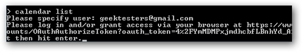 Nếu muốn sử dụng 1 dịch vụ trực tuyến nào đó, thì bạn cần kích hoạt tình trạng online của máy tính cùng với chương trình. Ví dụ, nếu muốn xem tất cả các cuộc họp của Calendar, thì chúng ta gõ Calendar list. Hệ thống sẽ hỏi bạn xác định cụ thể 1 tài khoản cố định, và điền địa chỉ Gmail, sau đó đường dẫn cụ thể sẽ được mở bằng trình duyệt mặc định của hệ thống: