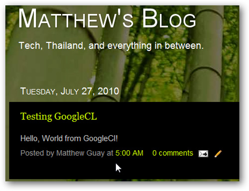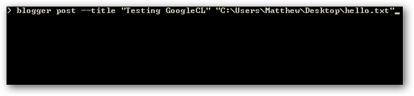 Với GoogleCL, người sử dụng có thể review, tag hoặc tạo những bài viết mới trên Blogger, tất cả đều được thực hiện bằng dòng lệnh. Trình bày phần thân của bài viết bằng file text, hoặc sử dụng HTML để chỉnh sửa giao diện theo ý muốn. Để làm việc này, các bạn gõ lệnh sau: