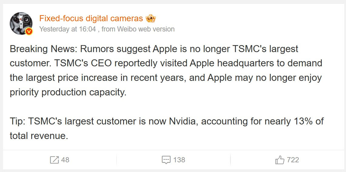 Ở phần cuối bài đăng trên Weibo, Fixed-focus digital cameras nhấn mạnh rằng NVIDIA hiện là khách hàng lớn nhất của TSMC, đóng góp khoảng 13% tổng doanh thu. Có thể khi “bong bóng AI” xì hơi, TSMC sẽ quay lại ưu ái Apple như trước. Tuy nhiên, điều đó khó xảy ra trong tương lai gần, bởi chi tiêu vốn của TSMC nhờ làn sóng AI được dự báo sẽ chạm mức kỷ lục, lên tới 52–56 tỷ USD chỉ riêng trong năm nay.