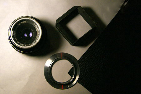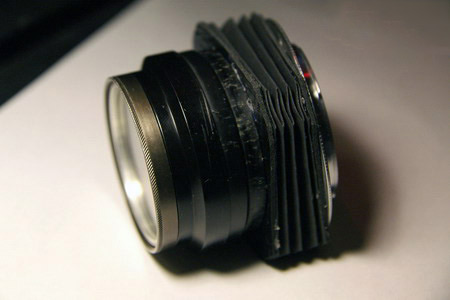 Những "nguyên vật liệu" được sử dụng ở đây là: một ống kính máy ảnh cơ Carl Zeiss 50mm f/2.8, một ống giấy gấp có thể co giãn, một ngàm chuyến đổi M42 - DSLR và một tấm da.