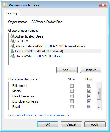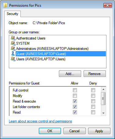 Trong trường hợp này bạn đã giới hạn quyền truy cập đến một folder cho một user riêng biệt (trong ví dụ này là tài khoản guest)