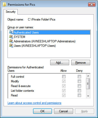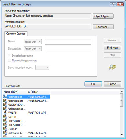 Để tìm kiếm tất cả các user, chọn nút Find Now và sau đó xác định user mà bạn muốn giới hạn quyền truy cập đến folder đó, sau đó nhấn OK. Bây giờ bạn sẽ thấy danh sách username trong cửa sổ Security Permissions, bạn hãy chọn một username ở trong danh sách này.