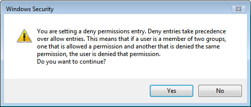 Bây giờ, bạn sẽ thấy một thông điệp Windows Security với nội dung là từ chối toàn bộ truy cập đến folder này. Chọn Yes, sau đó OK