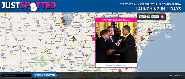 Trang web JustSpotted.com đã ra mắt từ tháng 10/2010 với một bản đồ trực tuyến thông báo về vị trí của người nổi tiếng theo thời gian thực dựa trên những cập nhật liên tục từ các trang Facebook và Twitter của các "sao."