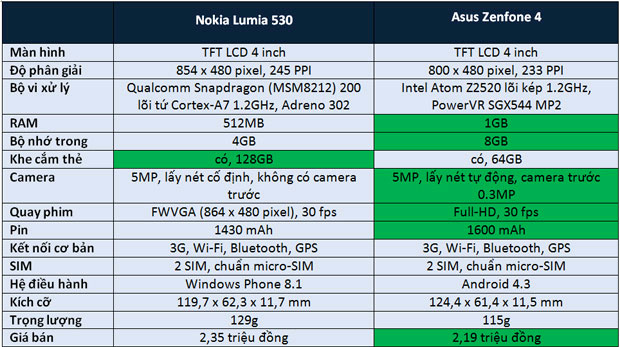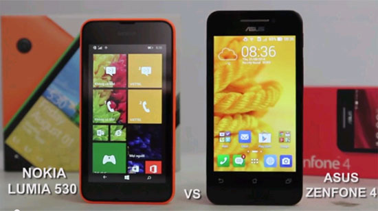 Asus và Nokia hiện đang đua tranh với nhau rất gay gắt ở phân khúc giá rẻ của thị trường smartphone. Ở từng mức giá 2, 3 và 4 triệu đồng, hai hãng này đều có những sản phẩm đối trọng nhau. Gần đây, chúng tôi đã có bài so sánh hai sản phẩm tầm giá 3 triệu đồng của hai hãng này là Nokia X2 và Asus Zenfone 4 A450 (phiên bản 4.5 inch). Hôm nay chúng tôi tiếp tục gửi tới bạn đọc bài so sánh ở tầm giá 2 triệu đồng giữa Nokia Lumia 530 và Asus Zenfone 4 (phiên bản có pin 1600 mAh). Asus cho biết các máy Asus Zenfone 4 hiện bán ra thị trường Việt Nam đều là phiên bản có pin 1600 mAh, tăng 400 mAh so với phiên bản trước đây.