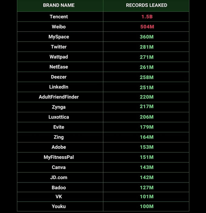 Theo Mashable, có đến 1,5 tỷ trong tổng số 2,6 tỷ hồ sơ cá nhân thuộc các nền tảng của Tencent nên đây là công ty bị ảnh hưởng nặng nhất trong vụ này. Tiếp đến là mạng xã hội Weibo với 504 triệu hồ sơ, Myspace 360 triệu, X 281 triệu, LinkedIn 251, Zing 164 triệu hồ sơ. Ngoài ra, Dropbox, Telegram... và các thông tin liên quan đến tổ chức phi chính phủ của Mỹ, Brazil, Đức, Thổ Nhĩ Kỳ, Philippines cũng có trong 12 terabyte dữ liệu.