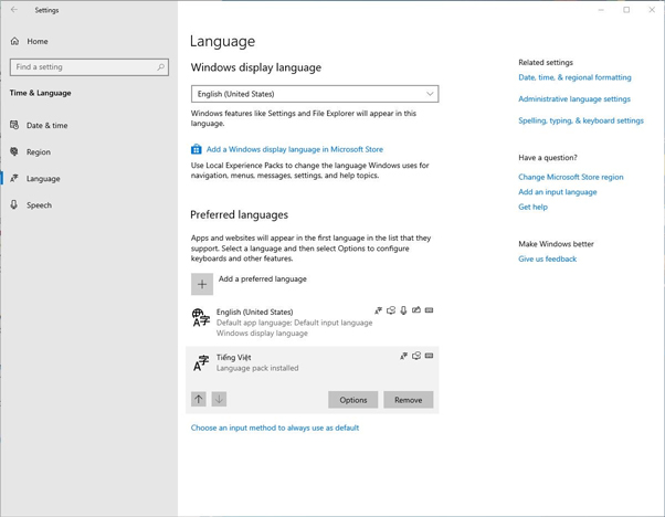 Sau khi cập nhật bản build 18351, bạn truy cập vào Settings -> chọn Time & Language -> chọn Language -> tại mục Preferred languages, nhấn dấu + để thêm ngôn ngữ Tiếng Việt.