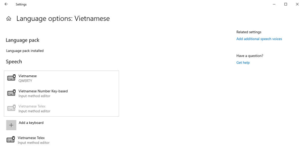 Sau khi cài đặt xong gói Tiếng Việt, bạn kích vào chọn Options -> Add a keyboard -> chọn Vietnamese Telex hoặc nếu bạn gõ VNI thì chọn Vietnamese Number Key-based.