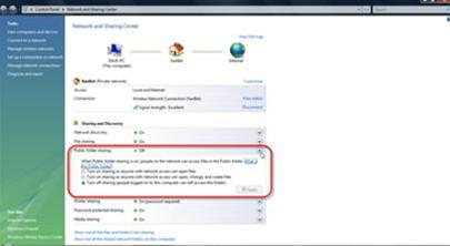 Nhấn vào Menu Start và phải chuột vào Network, chọn Properties hoặc vào Control Panel, chọn Network and Sharing Center. Tại cửa sổ mới, bạn chú ý đến phần khung giữa "Public folder sharing" và nhấn vào mũi tên bên phải để liệt kê các tùy chọn thiết lập.