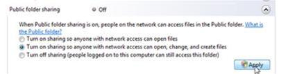 Trong trường hợp này, ta chọn tùy chọn thứ 2 để cho phép người dùng trong mạng có thể tùy nghi sử dụng dữ liệu được chia sẻ. Nhấn Apply để thực thi việc chọn lựa. Tuy nhiên, tùy thuộc vào UAC (User Account Control) và các thiết lập bảo mật trên máy tính mà có thể bạn sẽ được yêu cầu các quyền hạn của Quản trị viên (Administrator) để thực hiện công việc này.