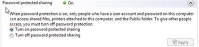 Bước tiếp theo, ta cần đặt mật khẩu cho thư mục chia sẻ dữ liệu chung trên mạng qua chức năng "Password Protected Sharing" trong Network and Sharing Center, bên dưới "Public Folder Sharing". Đây chỉ là một bước bảo mật cơ bản cho dữ liệu được chia sẻ qua mật khẩu (password) nên tùy thuộc vào người dùng có muốn sử dụng hay không. Thiết lập này sẽ buộc người dùng trong mạng nhập tên tài khoản và mật khẩu trước khi truy xuất dữ liệu từ máy tính chia sẻ dữ liệu. Chọn tắt hay mở (On/Off) rồi nhấn Apply để thực thi.