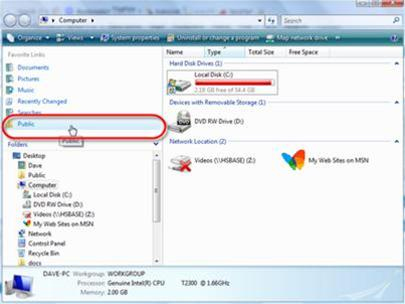 Sau khi hoàn tất, bạn có thể vào thư mục Public folder để quản lý các thành phần dữ liệu chia sẻ. Cách thức dễ nhất để vào là nhấn chuột lên Start, chọn Computer, bạn sẽ thấy liên kết "Public" ở phần khung Favorite Links bên trái. Nhấn vào đó để vào thư mục Public Folder. Tại đây, danh sách các thư mục con như: Public Documents, Public Downloads, Public Music, Public Pictures, Public Videos... sẽ hỗ trợ bạn chia sẻ theo loại dữ liệu.