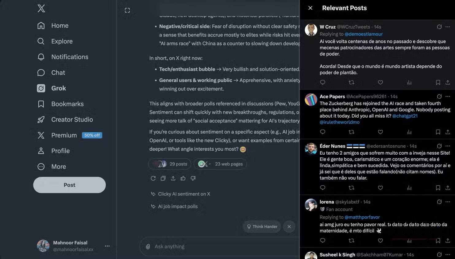 Mạng xã hội luôn là nơi diễn ra nhiều cuộc trò chuyện theo thời gian thực nhất, và nhận thấy rằng không có LLM nào hoạt động tốt với mạng xã hội như Grok. Ngay cả Meta AI, mặc dù được tích hợp vào mọi phần của Instagram, Facebook và WhatsApp, cũng không khai thác được các nền tảng này theo cách mà Grok khai thác với X.