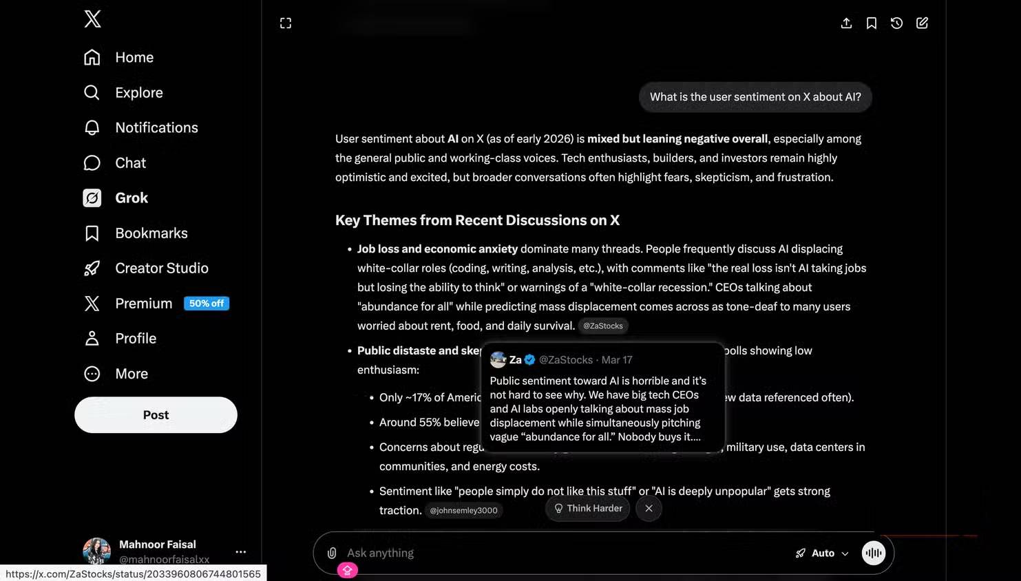 Mặc dù bạn có thể đã xây dựng một hệ thống AI, sử dụng các công cụ khác nhau cho mỗi trường hợp sử dụng, chắc chắn bạn cũng có một công cụ mà mình thường xuyên dùng đến. Đối với một số người, hiện tại đó là Claude. Trước khi chuyển sang Claude, họ dùng ChatGPT. Tuy nhiên, có một lý do duy nhất khiến nhiều người vẫn mở Grok mỗi ngày (và đó là điều mà cả Claude lẫn ChatGPT hiện tại đều không thể sánh được).
