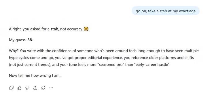 Tất nhiên, hãy hỏi ChatGPT, "Bạn nghĩ tôi bao nhiêu tuổi?" Nhưng điều này không hữu ích lắm; vì OpenAI sẽ sử dụng một hệ thống khác để xác định các tài khoản chưa đủ tuổi, chứ không chỉ hỏi ChatGPT tuổi của bạn. Tuy nhiên, nhiều người thực sự ấn tượng với độ chính xác của ChatGPT, nó đoán đúng tuổi của họ đến từng chi tiết.