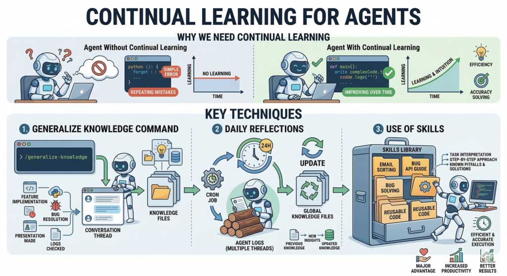 Các coding agent cũng có thể học theo cách tương tự, nhưng điều đó không xảy ra tự động. Bạn cần chủ động xây dựng cơ chế giúp agent ghi nhớ sai lầm, rút kinh nghiệm và cải thiện hiệu suất theo thời gian.