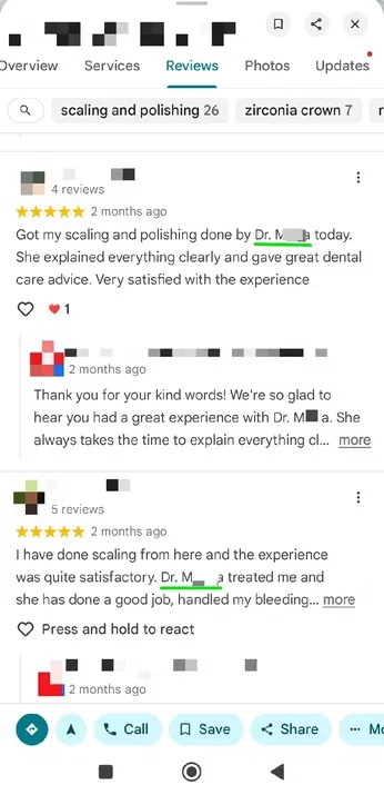 Nếu các đánh giá liên tục đề cập đến một tính năng, dịch vụ hoặc tên của một người cụ thể, chúng có thể do AI tạo ra. Việc này thường được thực hiện để tăng khả năng hiển thị trong kết quả tìm kiếm bằng cách thể hiện doanh nghiệp/cá nhân đó là chuyên gia.