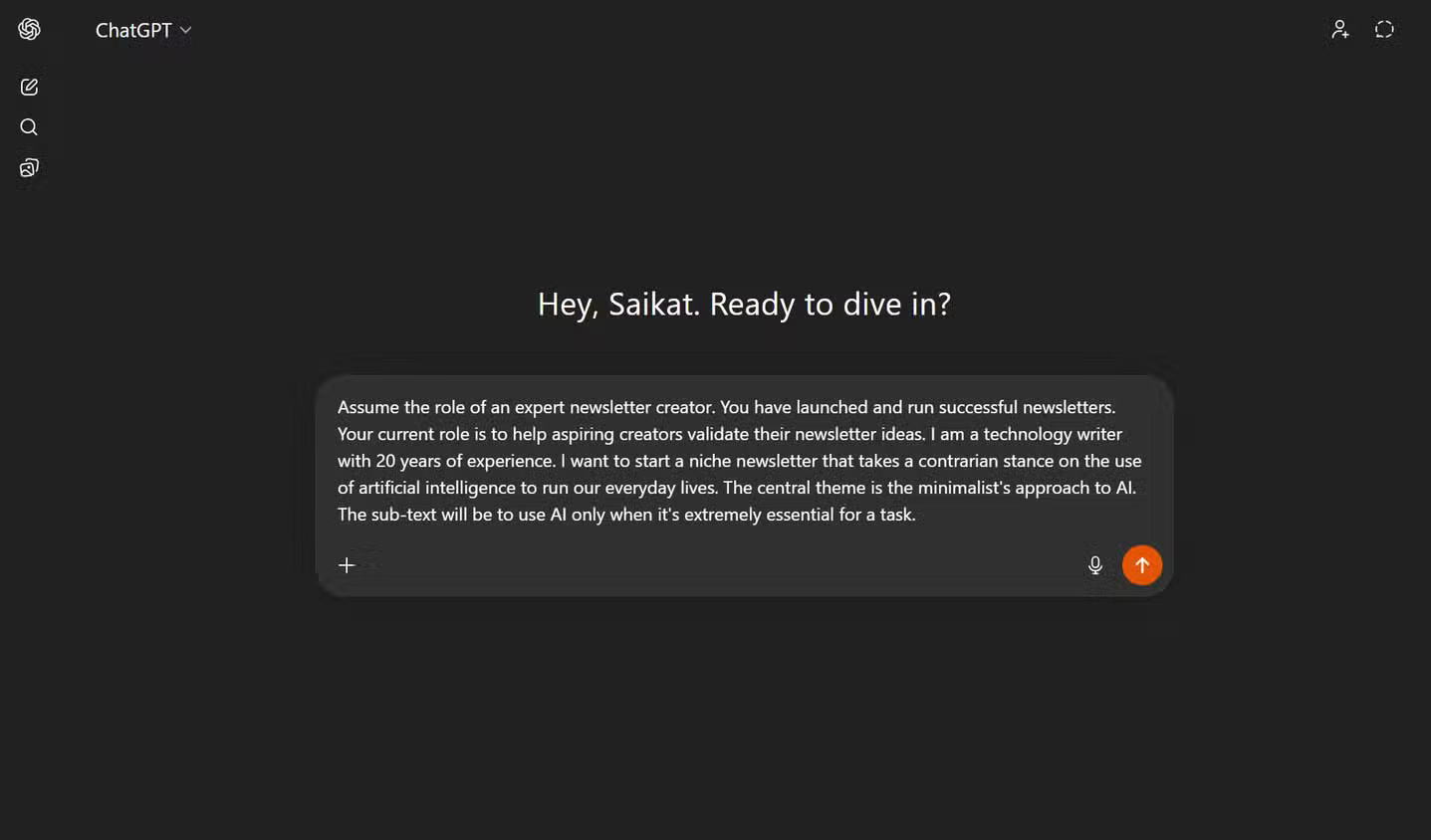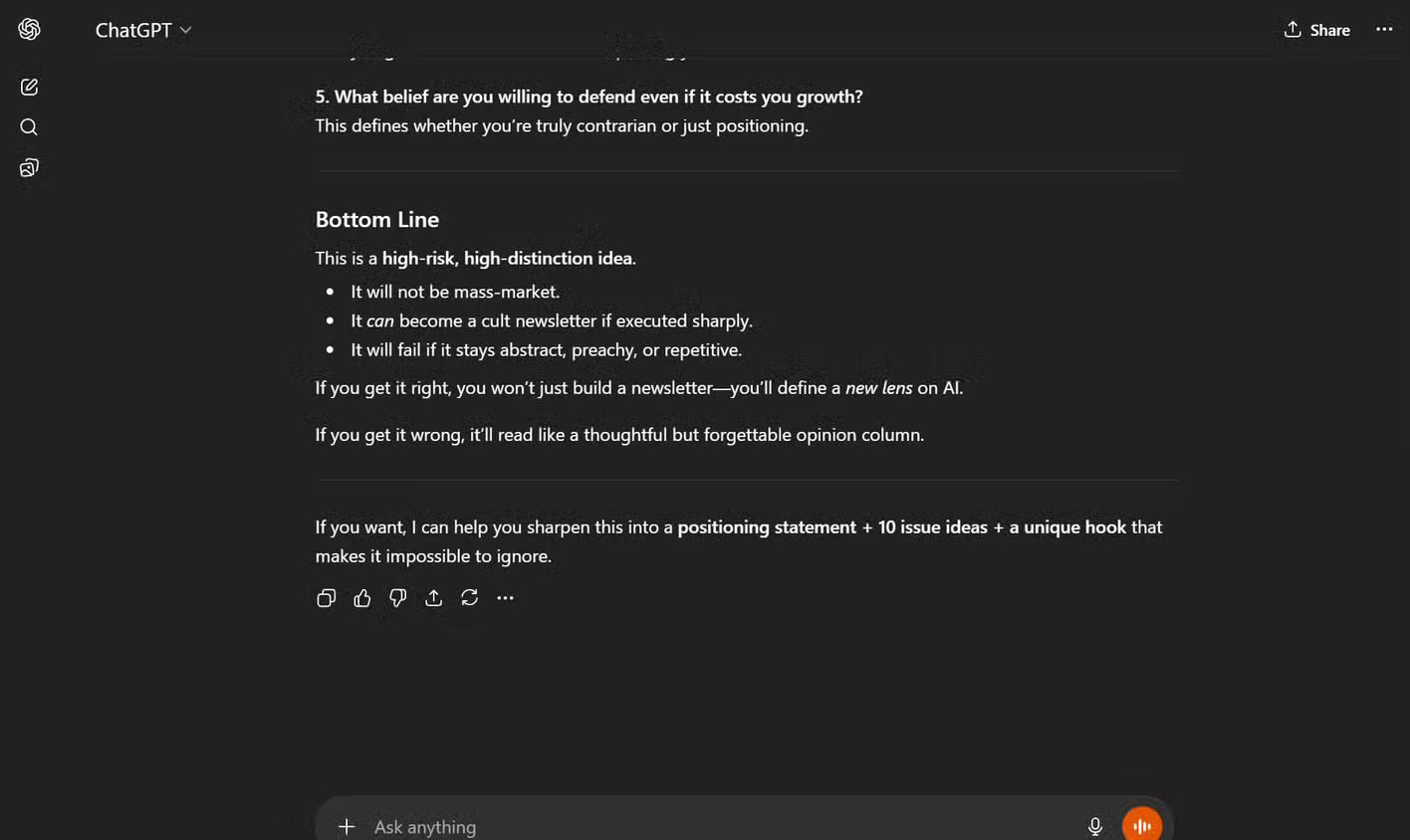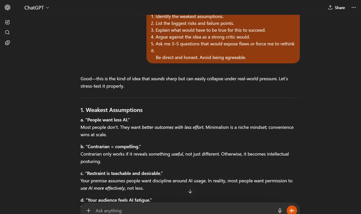 Hãy tranh luận chống lại ý tưởng như một nhà phê bình mạnh mẽ. Hỏi tôi 3-5 câu hỏi để vạch trần những thiếu sót hoặc buộc tôi phải suy nghĩ lại. Hãy trực tiếp và trung thực. Tránh tỏ ra dễ dãi.Phải thừa nhận, lần đầu tiên sử dụng tính năng này, nhiều người cảm thấy như mình đang trải qua một cơn ác mộng về năng suất. Rốt cuộc, chúng ta dùng ChatGPT để tìm câu trả lời nhanh cơ mà. Mọi người không quen với việc thấy ý tưởng của mình bị thách thức trực tiếp như vậy, đặc biệt là khi đang rất hào hứng với chúng.