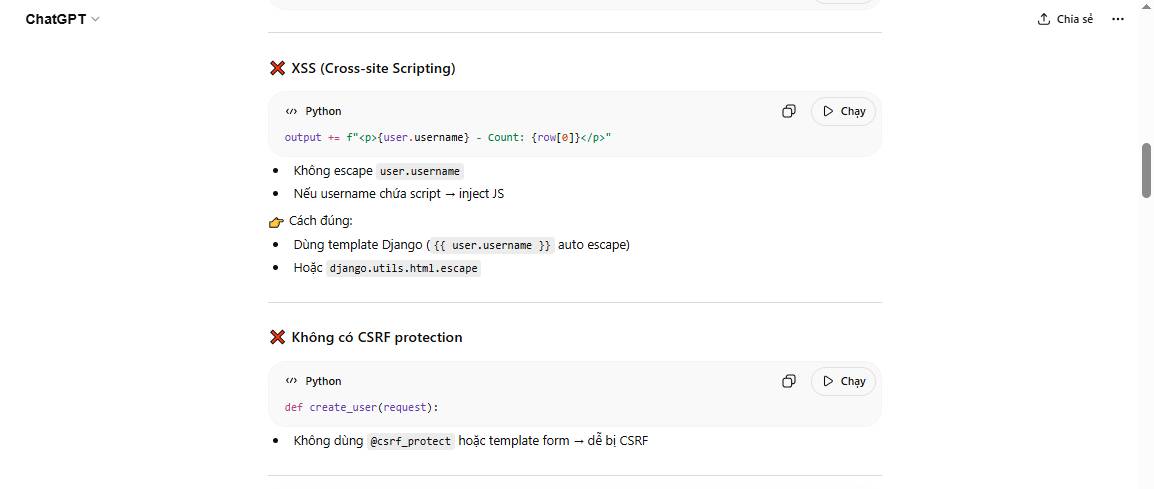# Không escape dữ liệu (có thể gây XSS nếu dùng dữ liệu ngoài)