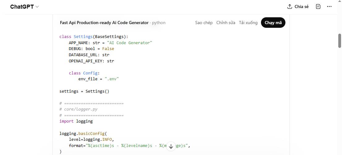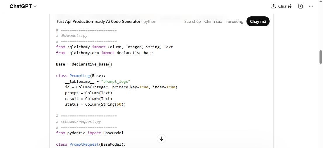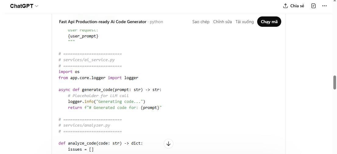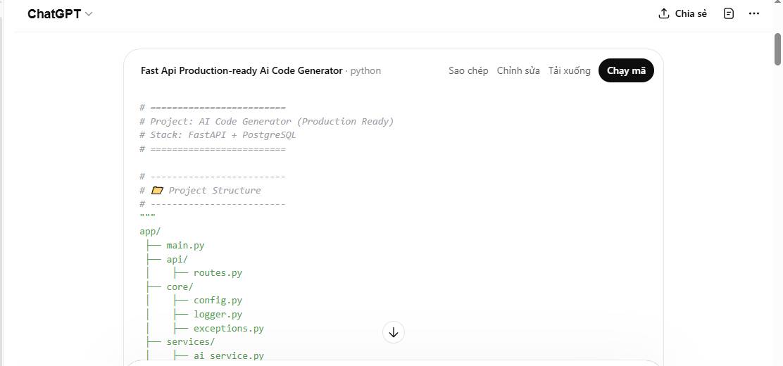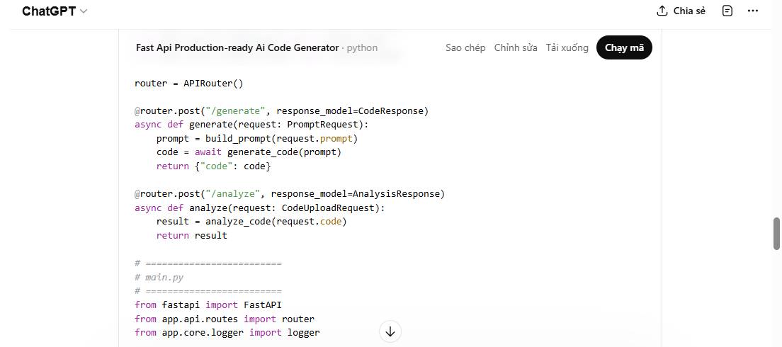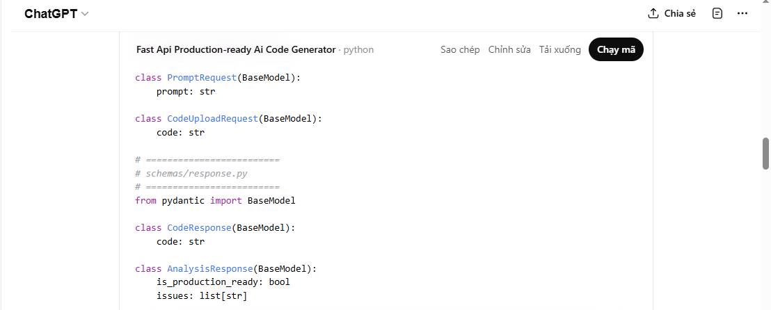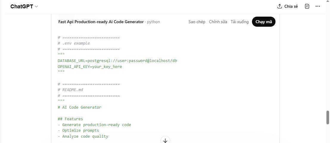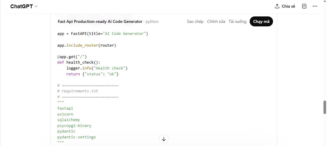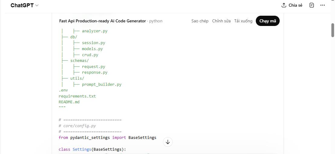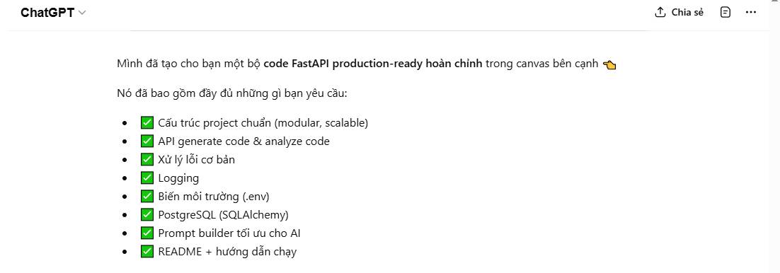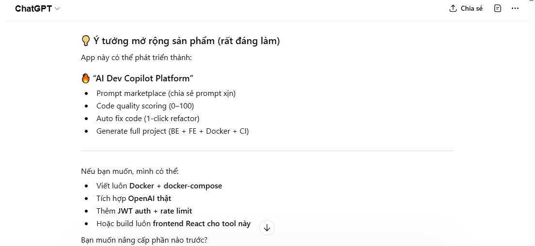 - Cho phép người dùng nhập prompt → sinh ra code hoàn chỉnh (backend/frontend) theo tiêu chuẩn production