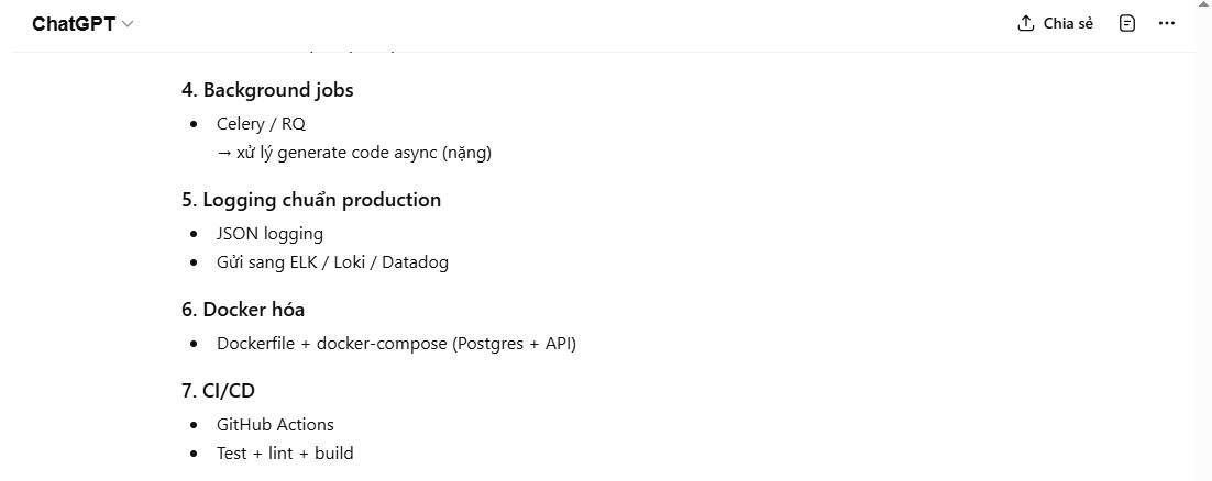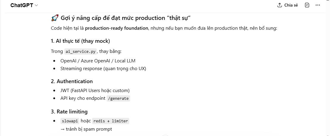 - Upload code → AI phân tích xem đã “production-ready” chưa