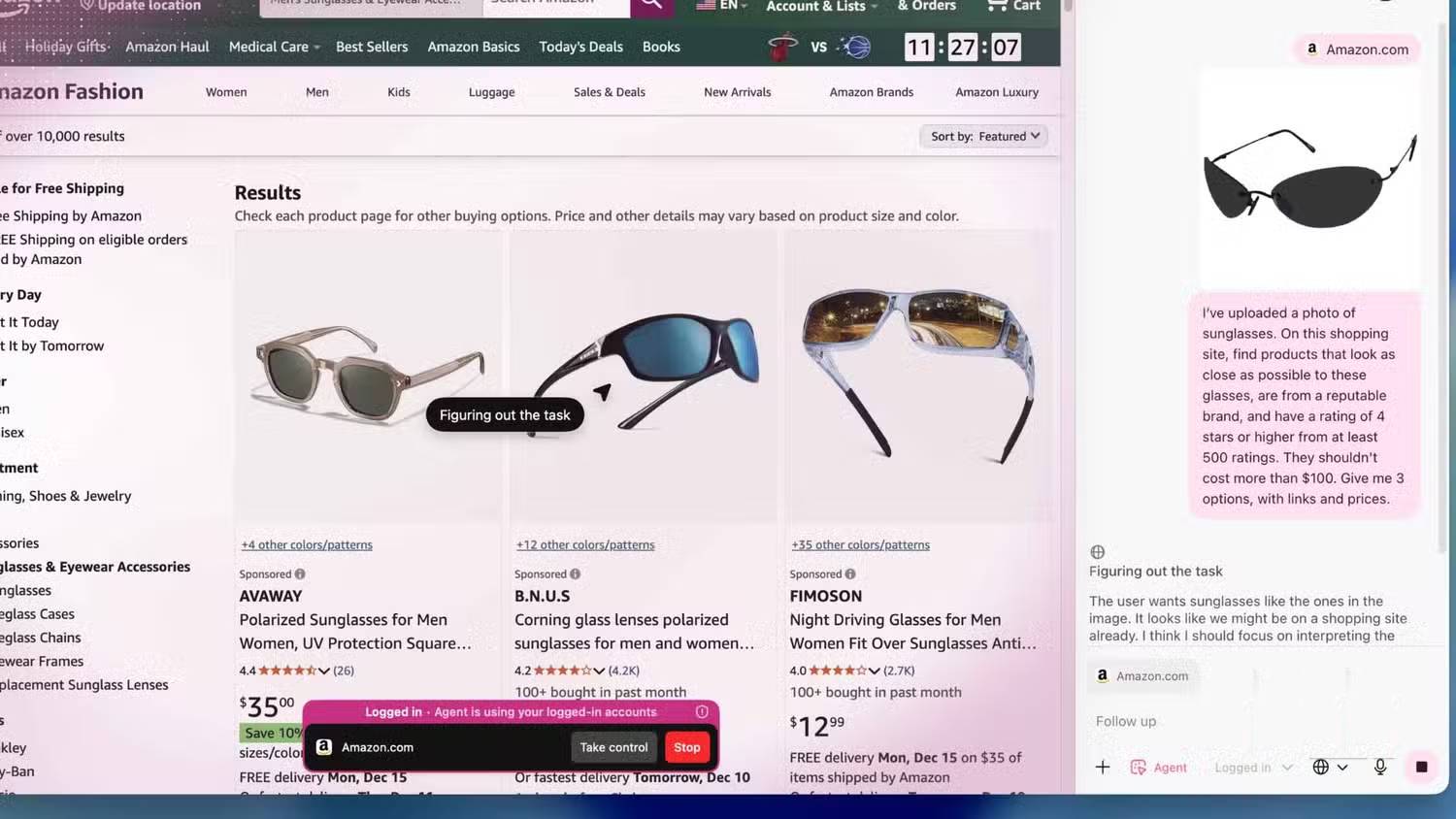 Nhiệm vụ khá đơn giản nhưng thực tế. Tác giả bài viết đã upload lên bức ảnh một cặp kính râm và yêu cầu agent tìm các sản phẩm trông tương tự trên một trang web mua sắm. Các ràng buộc rất rõ ràng: Thương hiệu uy tín, ít nhất xếp hạng 4 sao với 500 đánh giá trở lên, dưới 100 USD, cùng 3 lựa chọn cụ thể với liên kết và giá cả.