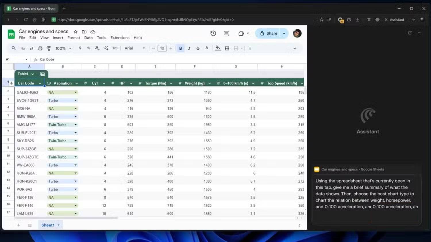 Tiếp theo là một nhiệm vụ về năng suất. Sử dụng một bảng tính đã mở sẵn, agent phải tóm tắt dữ liệu, chọn loại biểu đồ chính xác để hiển thị mối quan hệ giữa trọng lượng, mã lực và gia tốc từ 0 – 100, và sau đó thực sự xây dựng biểu đồ đó.