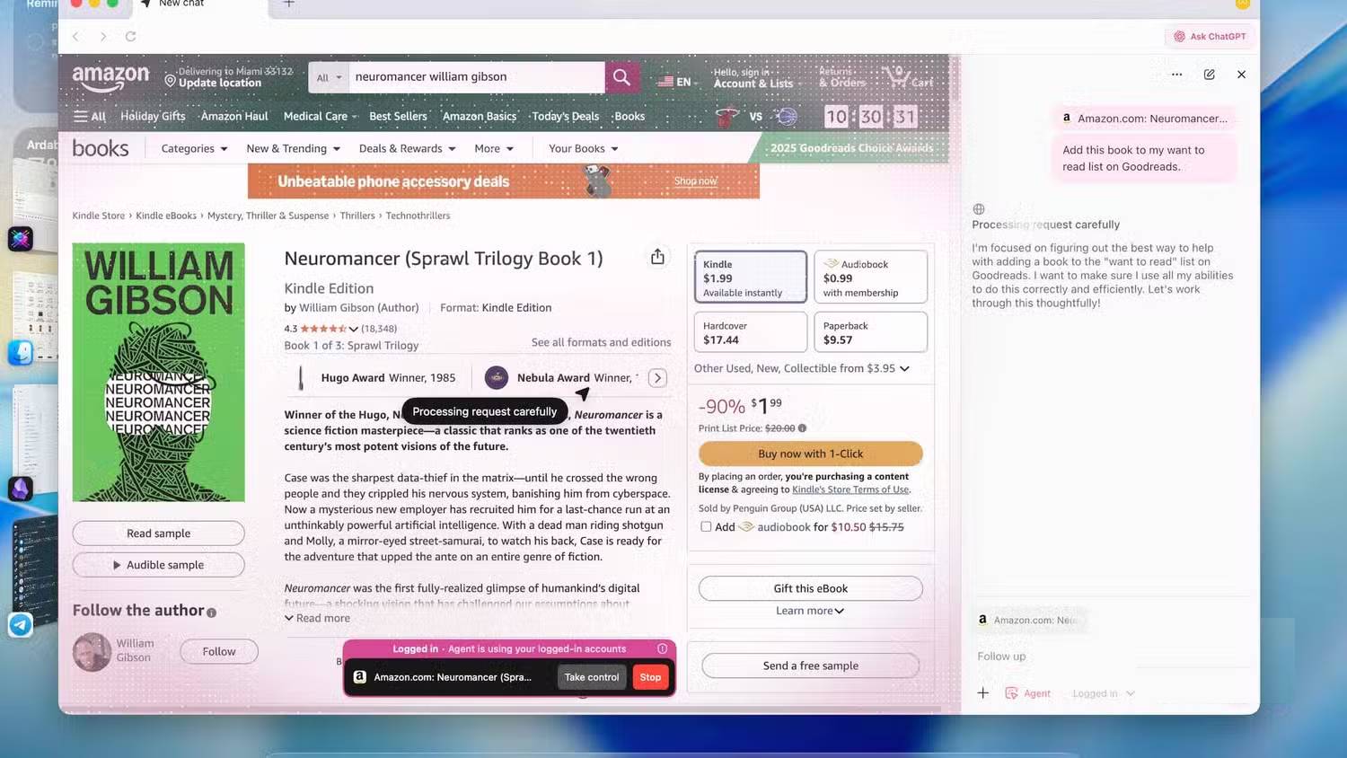Comet hoàn thành trong 59 giây. Nó mở Goodreads, tìm kiếm “Neuromancer”, chọn kết quả đầu tiên và thêm vào. Ít lỗi hơn Atlas, nhưng vẫn mất thời gian lâu hơn một chút.