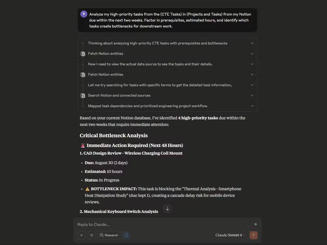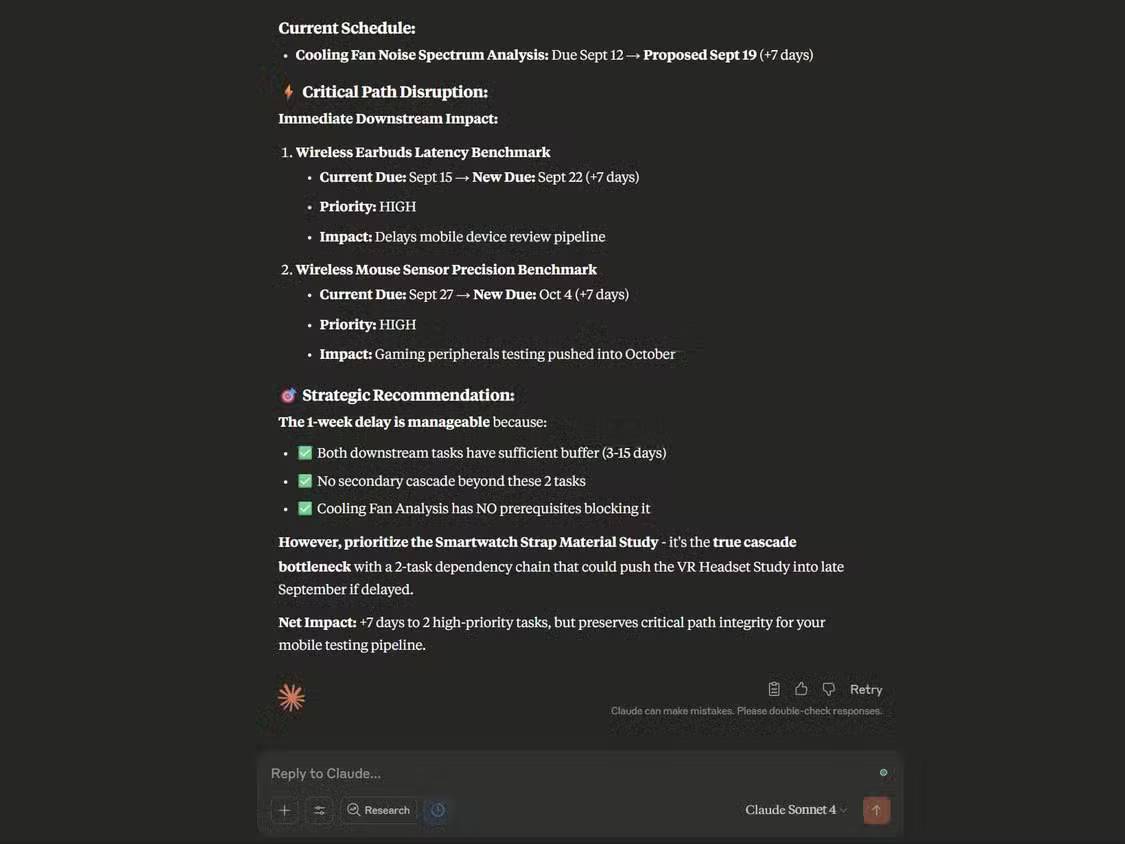 Ví dụ, Claude đã xác định rằng nhiệm vụ "Xem xét thiết kế CAD - Giá đỡ cuộn dây sạc không dây" (hạn chót ngày 30 tháng 8, ước tính 8 giờ) là điểm nghẽn làm chậm trễ 3 bài đánh giá thiết bị di động, và đề xuất ưu tiên nhiệm vụ này hơn nhiệm vụ "Phân tích switch bàn phím cơ", mặc dù hạn chót của nhiệm vụ sau sớm hơn 1 ngày.