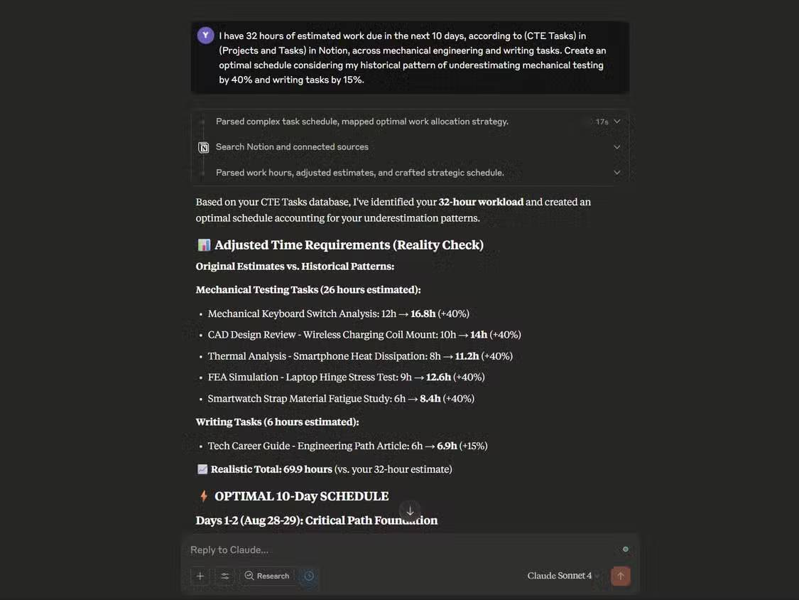 Trong một trường hợp khác, tác giả bài viết yêu cầu Claude tối ưu hóa lịch trình cho 32 giờ làm việc trong 10 ngày tới, có tính đến thói quen ít chú ý thường thấy - 40% cho thử nghiệm cơ khí và 15% cho các nhiệm vụ viết. Claude đã điều chỉnh nhiệm vụ "Xem xét thiết kế CAD" từ 10 giờ thành 14 giờ và đề xuất hoàn thành nó trước nhiệm vụ "Phân tích nhiệt - Nghiên cứu tản nhiệt điện thoại thông minh".