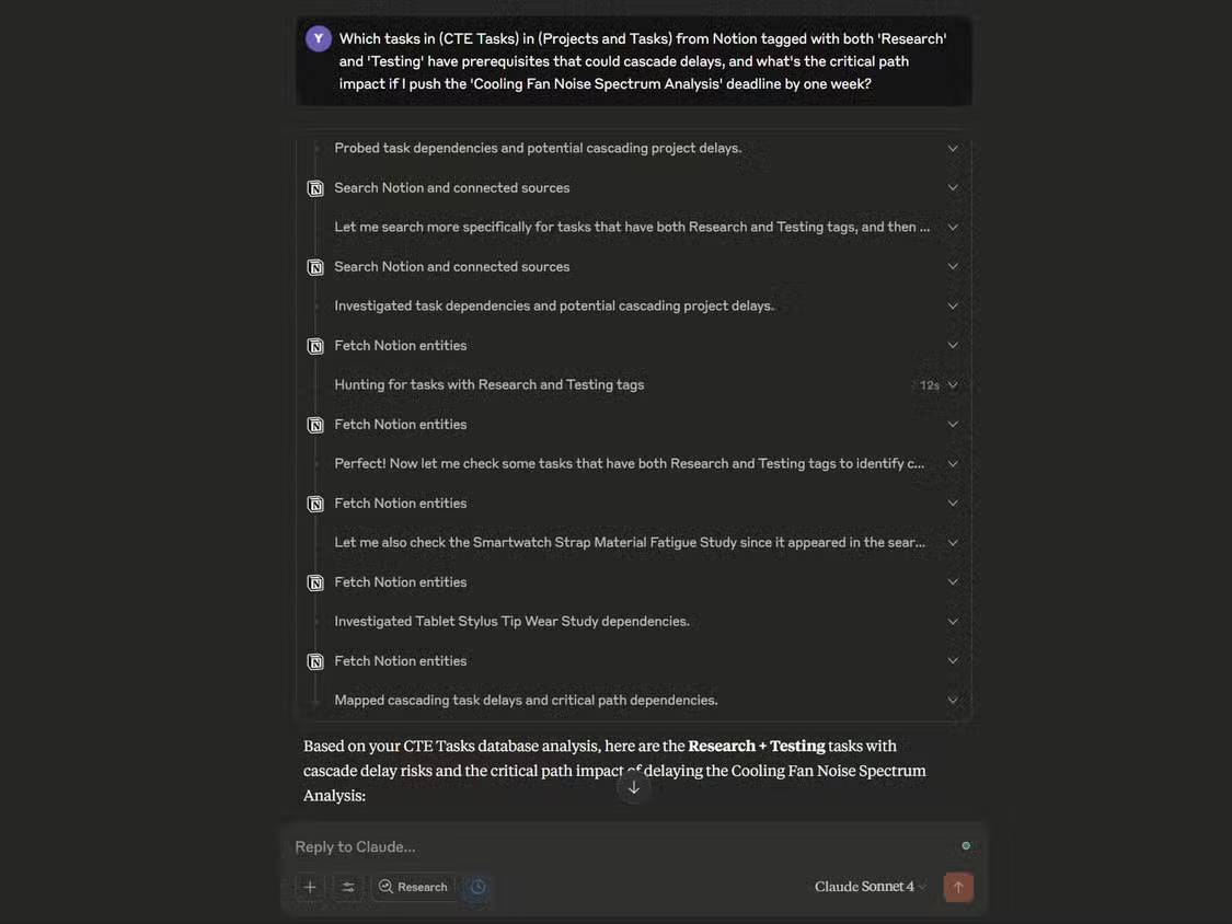 Claude cũng theo dõi hiệu quả các mối quan hệ phụ thuộc điều kiện tiên quyết. Khi hỏi về các nhiệm vụ được gắn thẻ "Nghiên cứu" và "Kiểm thử", cũng như tác động của việc trì hoãn "Phân tích phổ tiếng ồn quạt làm mát" một tuần, nó đã cho thấy rõ ràng sự trì hoãn này sẽ ảnh hưởng như thế nào đến hai đánh giá tiếp theo phụ thuộc vào các phép đo đó. Mối liên hệ này không rõ ràng chỉ từ tiêu đề nhiệm vụ mà xuất hiện từ các liên kết điều kiện tiên quyết được lập bản đồ trong Notion.